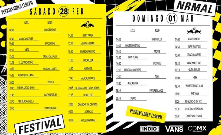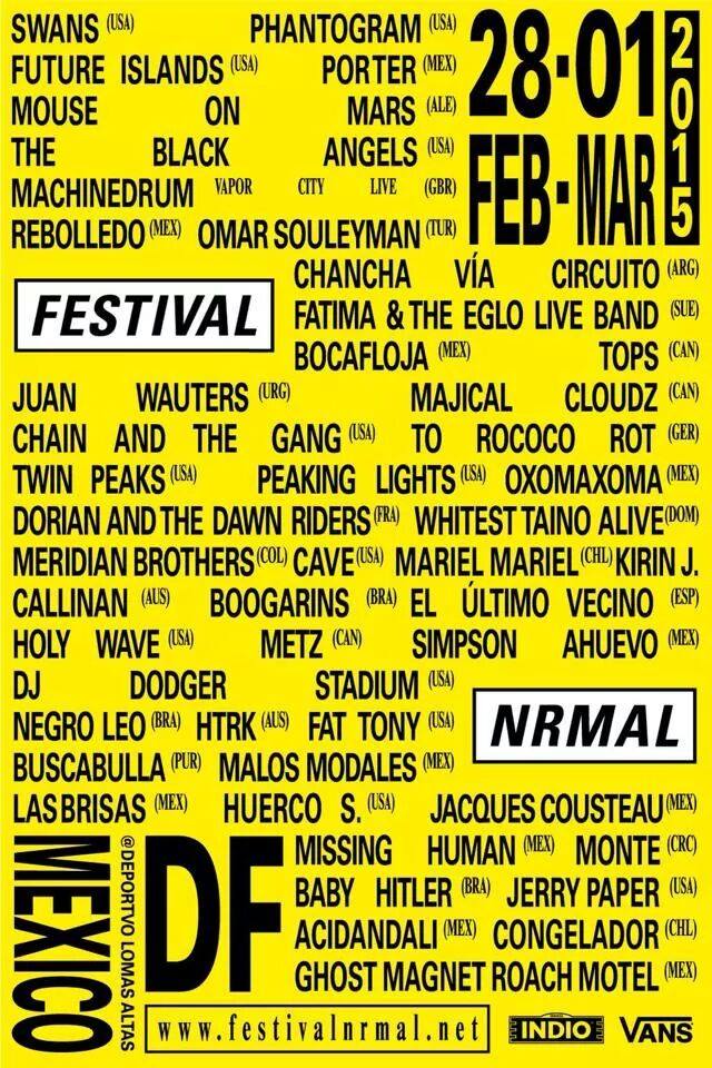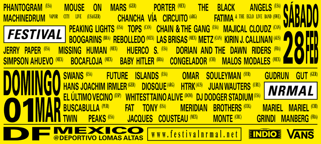 Aquí te presentamos todas las confirmaciones para que vayas mojando truza y preparando tu ruta en la que quizás conozcas a tu banda favorita. Larga vida al NRMAL, el que va que vuela a ser el mejor festival de musica de México.