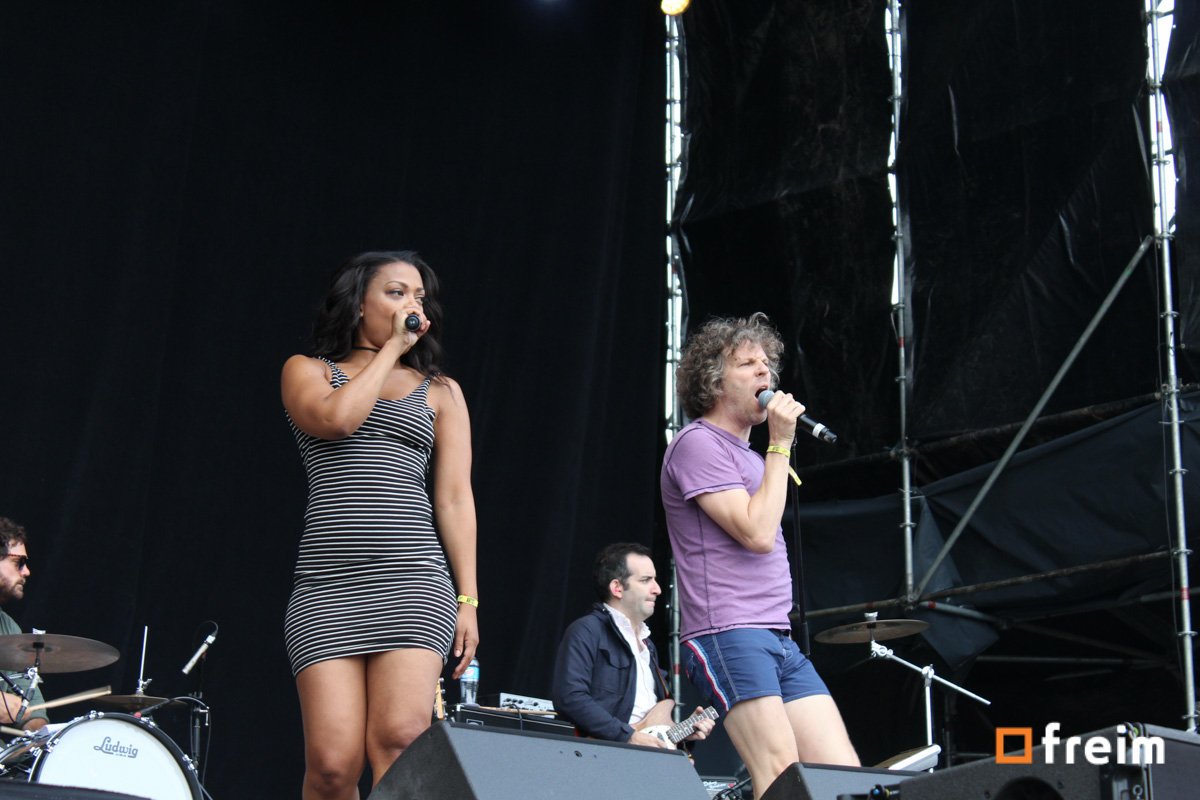 !!! una banda que dio una muestra de cómo la música puede fusionarse con un performance atrevido, como se vio el atuendo principal, unos shorts domingueros; comunes de hace más de dos décadas, y una simple playera, y su coautora en este performance con gran sensualidad y muy cautivadora apariencia; pusieron a mover a la gente con buenos sonidos eléctricos y retomando un ritmo de disco.