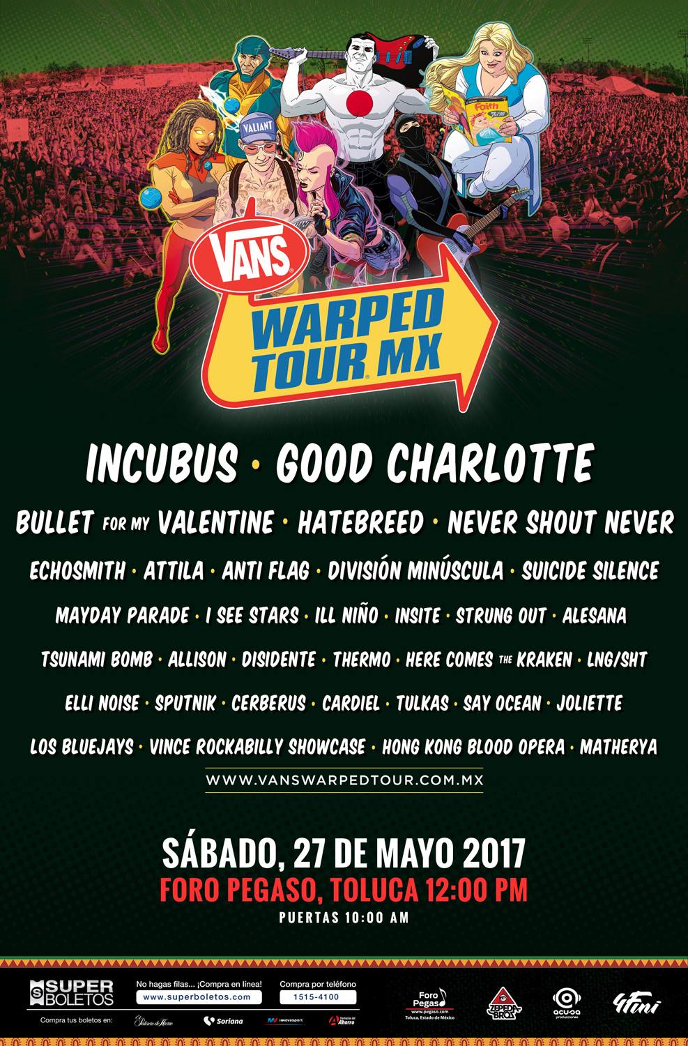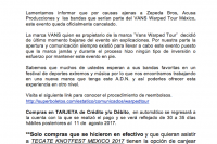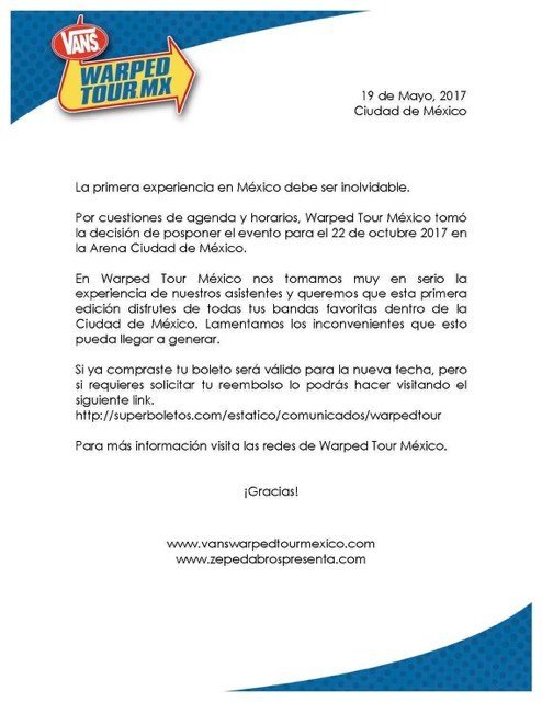 el día de hoy 19 de mayo el Warped Tour pospone su fecha para el 22 de octubre de 2017 en la Arena Ciudad de México. Todos los boletos serán válidos para la nueva fecha, y en caso de requerir reembolso podrán hacerlo directo en Súperboletos.