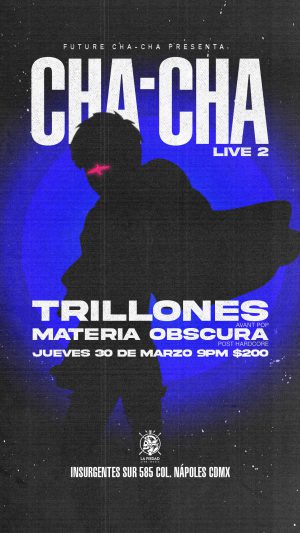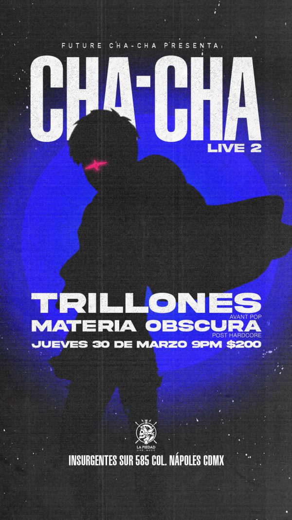 Trillones y Materia Oscura se unen para la segunda edición del Cha-Cha para finales de este mes llega de la mano la nueva entrega de las Cha-Cha Live, noches de música en vivo en La Piedad Live Music, el nuevo stage bar de la CDMX.